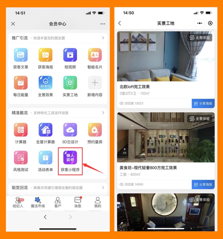 打开装企精灵,进入获客小程序,点击VR工地,将工地分享到业主群。接下来,美好的事情即将发生。